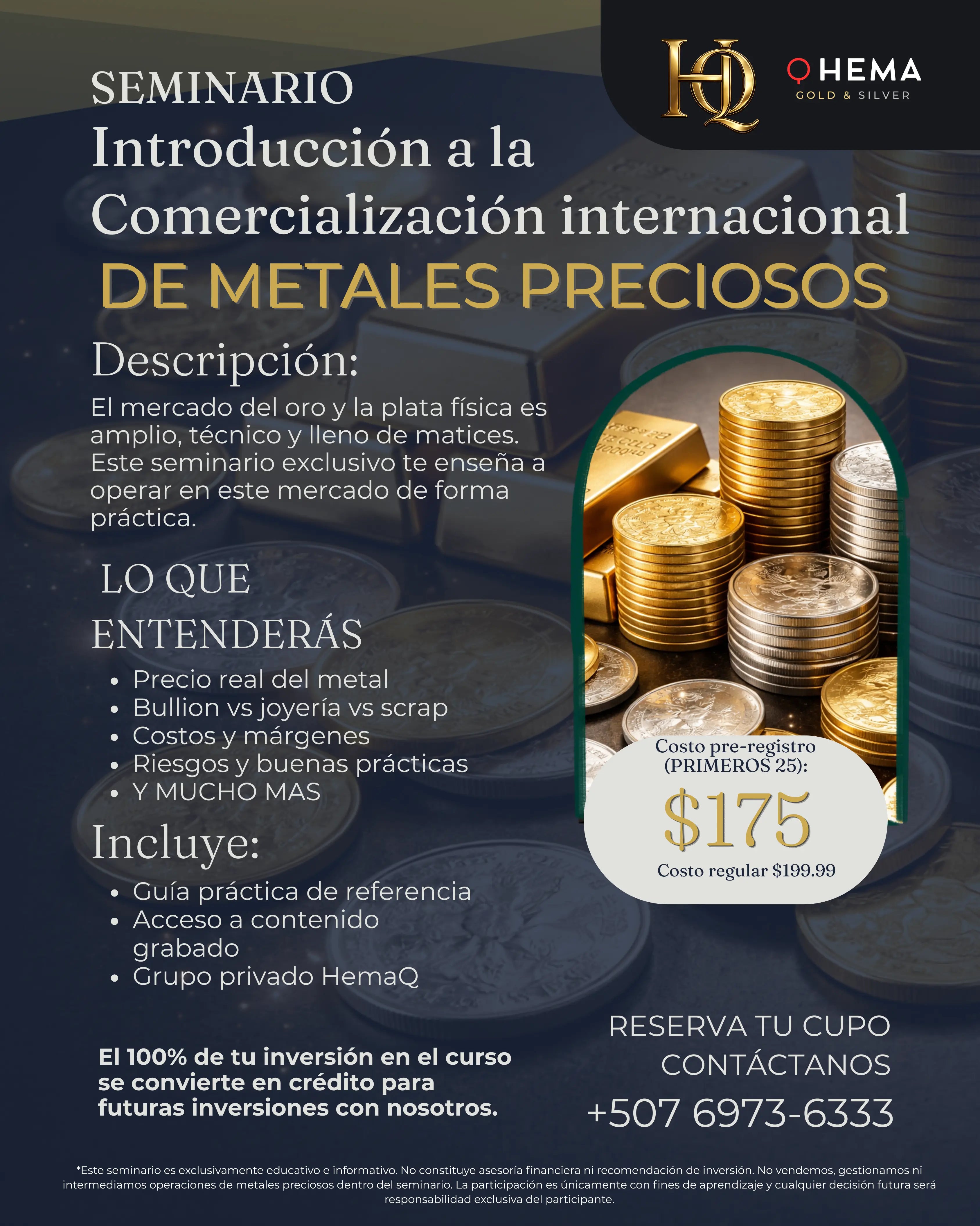 Este seminario es de carácter estrictamente educativo e informativo. No constituye asesoría financiera, de inversión, ni recomendación de compra o venta. Los organizadores no venden metales preciosos dentro del marco del seminario, no gestionan operaciones ni actúan como intermediarios. La participación implica la aceptación total del disclaimer legal disponible en hemaq.com/seminario.